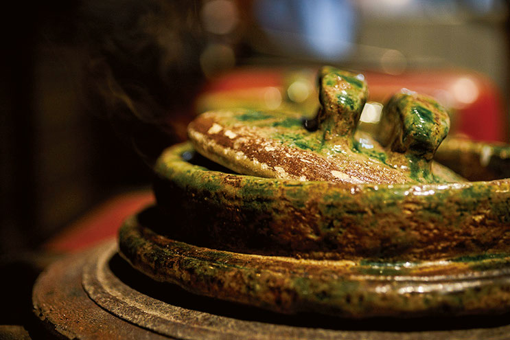 “お竈さん”とは、京都の言葉でかまどのこと。『なかひがし』のカウンター前に鎮座している弁柄色のそれは、滋賀県の湖東焼、中川一志郎氏によるものだ。