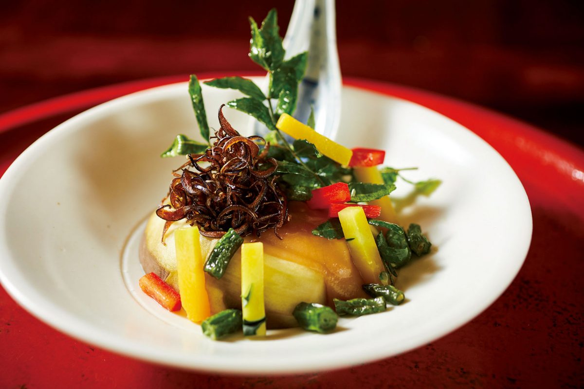 根菜のお盆で供された炊合わせは、賀茂茄子。ひと口食べると厚く締まった果肉から濃厚な味わいとともに夏の香りが広がり、自家製の白味噌餡がさらりとした甘みを加えている。散りばめられた二色のパプリカといんげん豆は短冊、素揚げした山椒葉は笹に見立てられ、れんげの琵琶を爪弾いて、七夕に願いが叶うかどうかはなすがまま。軽妙な言葉と力強い野菜の味に頬を緩ませながら、気が付いた。華やかな香りを放つ山椒の木の芽は春先に出回るもののはず。