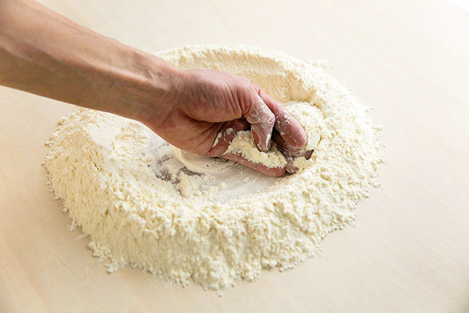 1 分量の小麦粉の約8割(640g)を台の上に山型に乗せ、中央にくぼみを作って直径30㎝程度の土手を作る。