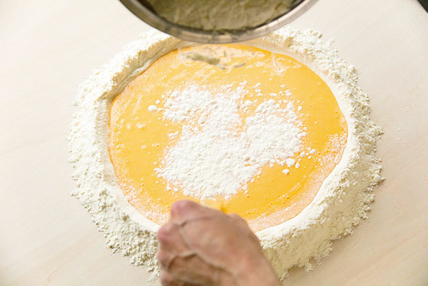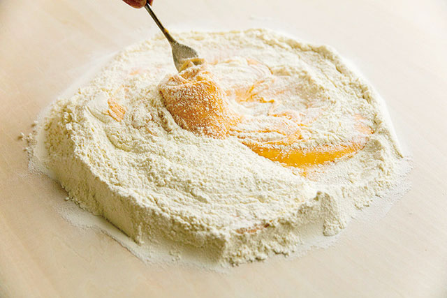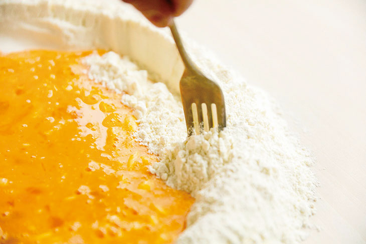 3 卵がまんべんなく混ざったら、土手を内側から少しずつ崩しながら、卵に粉を混ぜ込んでいく。