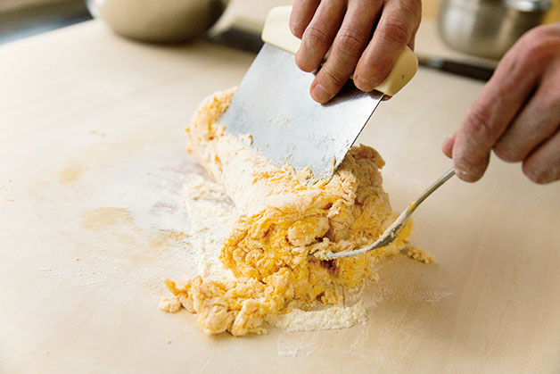 9 生地がまとまったら一度どかし、スクレーパーなどで台にこびりついて固くなった余計な生地を取り除く。