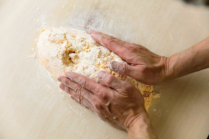 11 空気を中に入れるように縦横に生地を織り込みながら、手でやさしく捏ねる。手につく時は打ち粉をする。