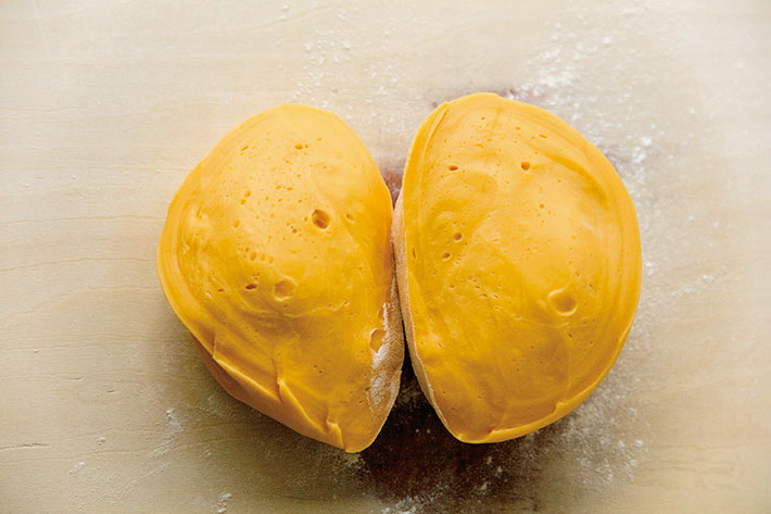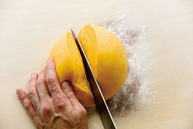 12 約20分間生地を捏ね、赤ちゃんの頬くらいのやわらかさに仕上げる。生地を丸めて、包丁で二つに切る。
