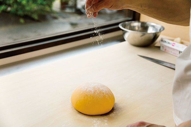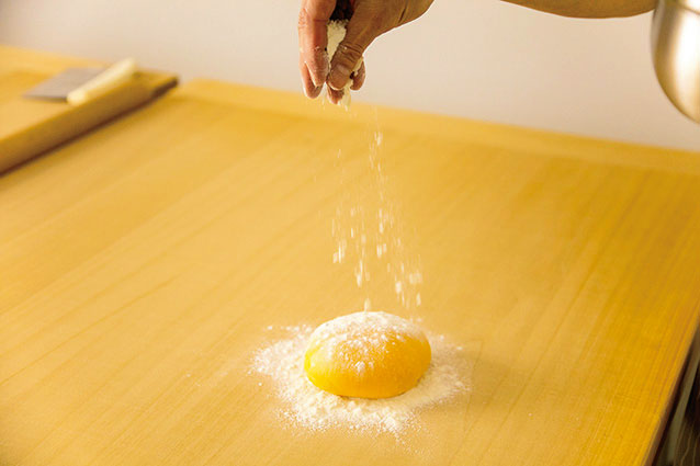 16 台に打ち粉をし、生地を置いた上からさらに打ち粉を一つかみ程度かける。これ以降打ち粉は少量ずつ行う。