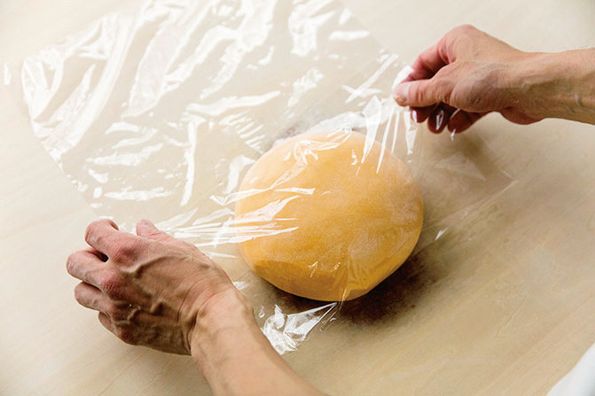 15 空気が入らないよう生地をラップでくるみ、冷蔵庫で40分程寝かせる。生地が落ち着き伸ばしやすくなる。