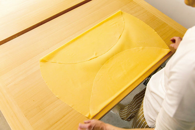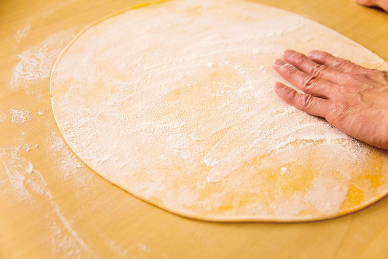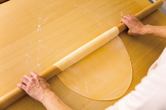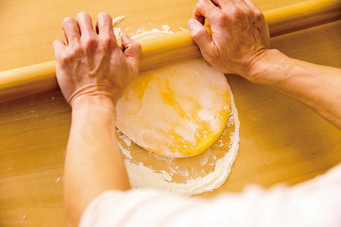 そんな、河村氏が自信と誇りを持って技術を継承している、ボローニャの手打ちパスタ最大の特徴は、麺棒を使用すること。日本で手打ちパスタというと、そのほとんどがパスタマシンを使用する機械式。しかし、基本は打ち台と麺棒と材料さえあれば、好みの生地が作れるというボローニャ式の利便性は、やはり生活に根付いた伝統的スタイルからくるものなのだろう。つまりは、家庭や趣味で手打ちパスタに挑戦するなら、高級マシンなどを買わずに、最低限のアイテムで始められるボローニャ式がうってつけだということ。とはいえ、シンプルな道具と材料で作るということは、それなりの技術と知識を要するということではなかろうか。
