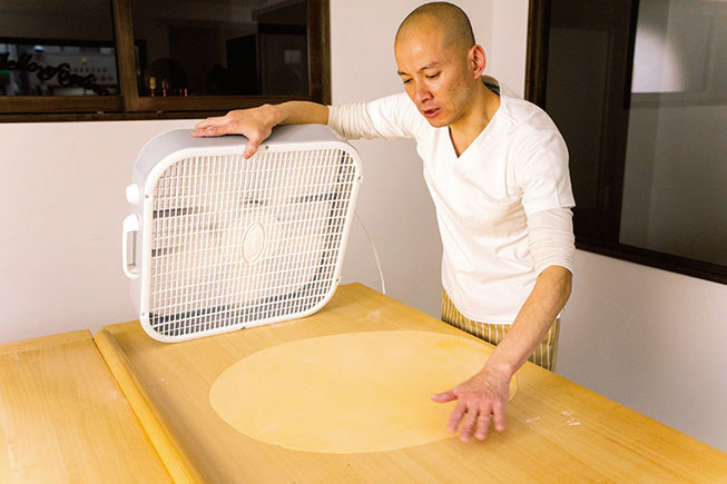 20 1mm以下の薄さに伸ばし、扇風機で2~3分風をあてる。余計な粉や不純物を掃いながら両面とも乾かす。