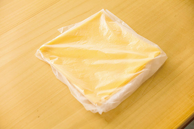 22 たたんだ生地をビニール袋でくるみ20分室温で寝かせた後、再び20の工程をおこない生地が完成する。
