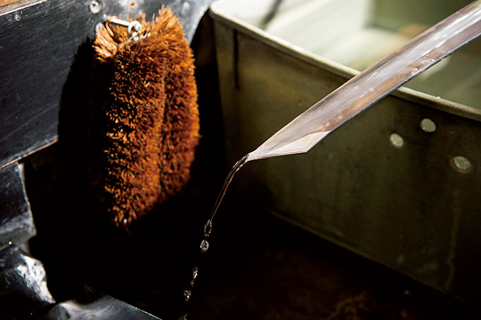 研いだ包丁に水を落として、研ぎの様子を見る。水が刃先から落ちるということは、しのぎの削りが甘いということ。切っ先から水が落ちれば、しのぎがきれいにそっている証拠となる。