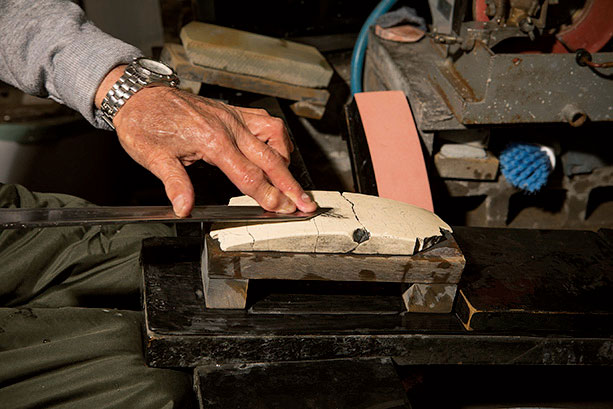 坂下氏は日本中から届く包丁を研ぎながら、自らの包丁造りも行う。「包丁屋の中にも今は、造るだけで包丁のことを知らない職人が多い。包丁を造れても、研ぎができなければ一流とは言えないんよ。私は包丁を買ってくれた料理人たちに、包丁とはどんな道具かまでを教えてるんよ。そこで、『包丁は研ぐな、減らすな』と口をすっぱく話してる」