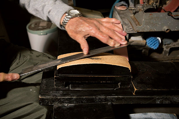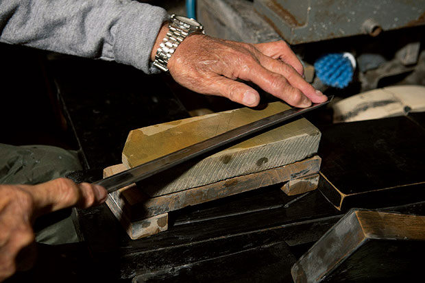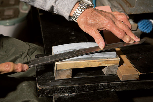 坂下氏は日本中から届く包丁を研ぎながら、自らの包丁造りも行う。「包丁屋の中にも今は、造るだけで包丁のことを知らない職人が多い。包丁を造れても、研ぎができなければ一流とは言えないんよ。私は包丁を買ってくれた料理人たちに、包丁とはどんな道具かまでを教えてるんよ。そこで、『包丁は研ぐな、減らすな』と口をすっぱく話してる」