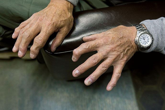 やすりをかける圧力で変形した指は坂下氏の仕事の勲章だ。