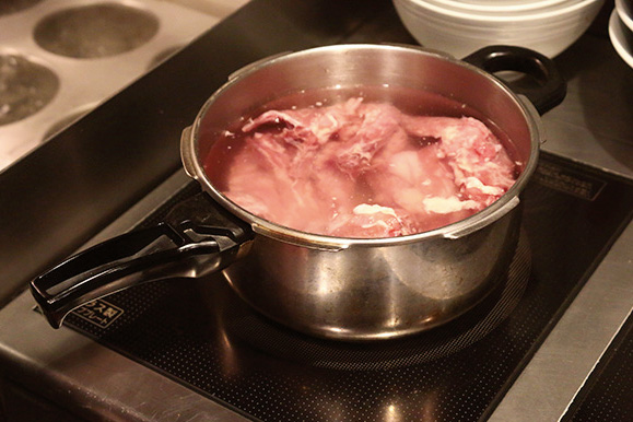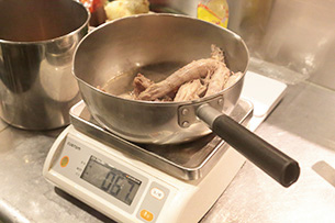 1 清湯で残ったガラを、重量の2倍の水から強火で炊く。
