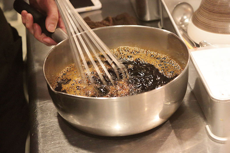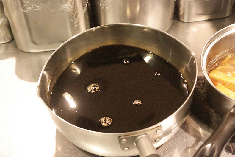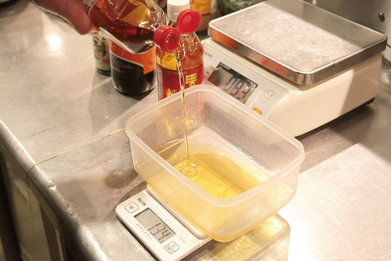 旨味と甘みを感じるラーメンに欠かせない醤油ダレ。甘みを生むリンゴ酢と、2種をブレンドして醤油の香りを増幅させることがポイント。担々麺と醤油ラーメンに使用する。