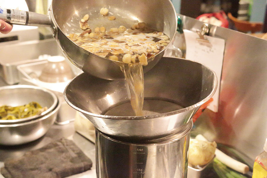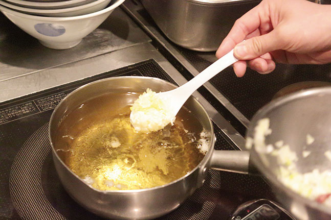 香味野菜の風味を移した油は、芳醇な香りに欠かせない。塩ラーメンに使用する。