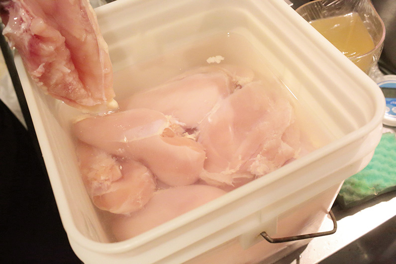 1 鶏は他の材料を混ぜた調味液で一晩漬け込む。