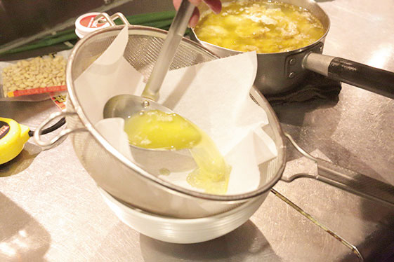 2 表層に浮きあがった黄色い油のみをレードルで掬い取り、キッチンペーパーで濾す。