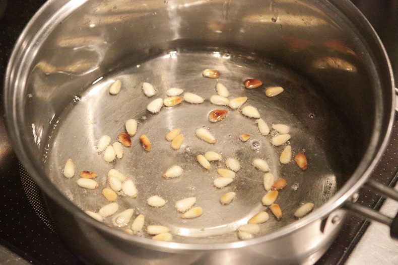 1 キャノーラ油に松の実を入れ、弱火で揚げる。