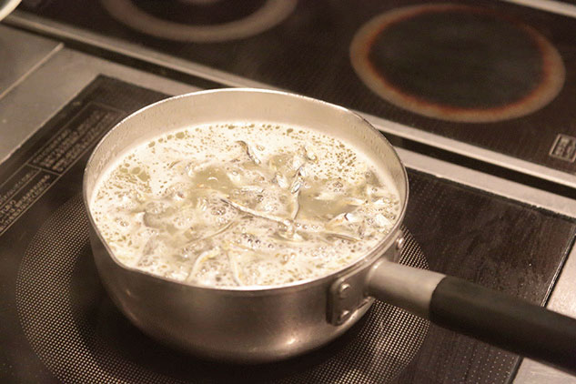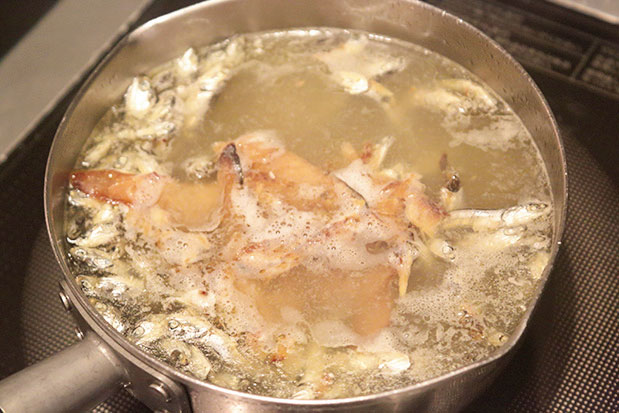 1 雪平鍋に水を張り、煮干しを加えたら中強火にかける。