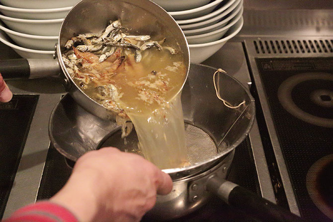 3 計10分加熱し、旨味を引き出したうえで、ザルで濾し別鍋に移す。