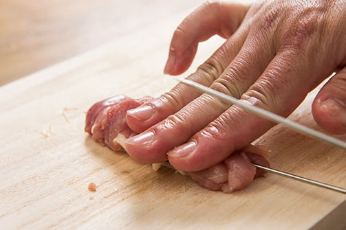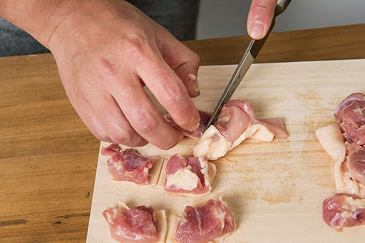 3 2㎝ほどの大きさに切っていく。肉を平らにしたいので、余計なでっぱりは取り除く。