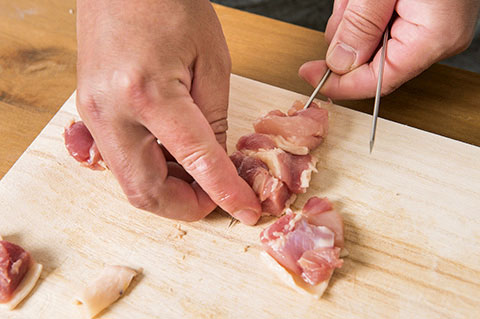 4 金串に鶏肉を刺していく。目安としては4~5個ほど、同じ高さになるように刺す。