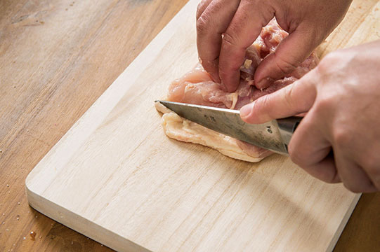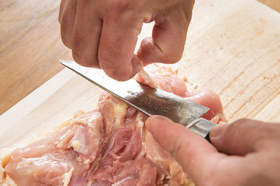 1 まず、鶏もも肉の掃除を行う。鶏のスネ側のスジが口に残るので、取り除いていく。