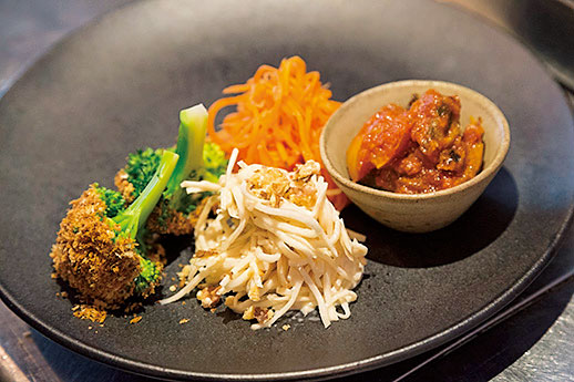 家酒場を盛り上げる最初の一皿の前菜は、盛りつけも重要な要素。さまざまな料理が一つの皿に美しく盛られていると、それだけで掴みはOKだ。