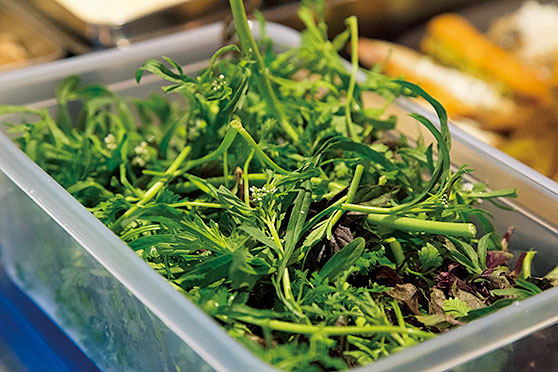 「ハーブにも色々な形があり、それぞれに生命力のある動きを持っているので最後に全体のバランスを見ながら散らすと調和が生まれます」と八巻氏。料理に自然な動きが出る他、彩りもプラスされ、一石二鳥だ。