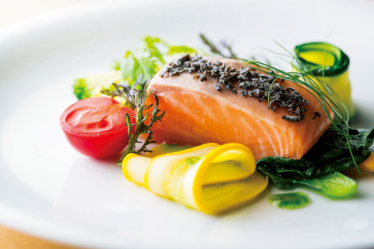 皿に盛り付け、塩昆布のみじん切りをまぶし、レモンビネグレットとパセリオイルで和えた茹で野菜を添える。