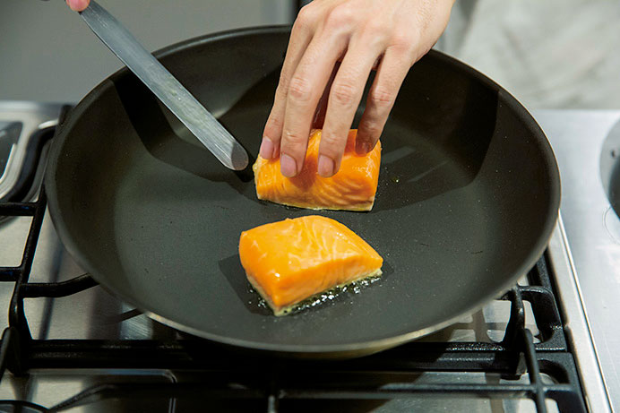 袋からサーモンを取り出し、高温に熱したフライパンで皮目から両面を焼き、皿に盛り付ける。