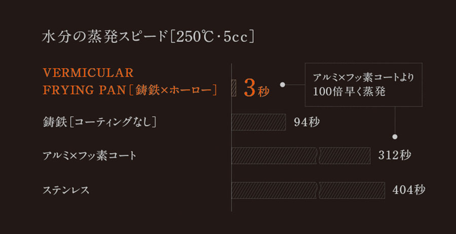 250℃・5ccで水分の蒸発スピードを実験したところ、「バーミキュラ フライパン」はアルミ・フッ素コーティングのフライパンと比較した場合の100倍早く蒸発したというから驚きだ。
