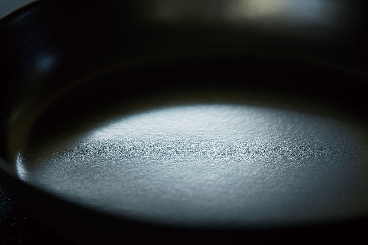 まず1.5mmという極限の薄さと、鋳鉄ホーロー製とは思えないほどの軽さに驚く。一般的に、鋳物ホーローのフライパンというと3〜5mm程度の厚みがあるもの。この薄さは日本の職人の技術によって到達したものだ。