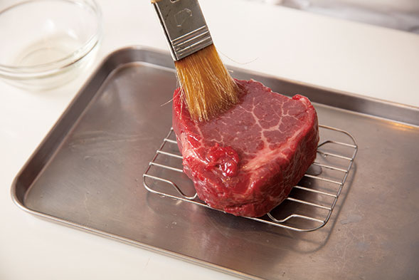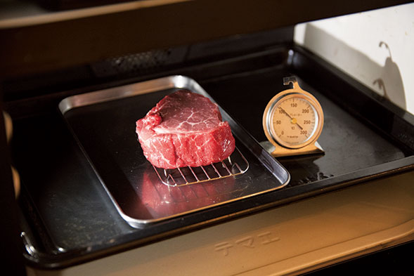 「レストランではオーブンのそばに置いて、牛の体温である45°Cくらいまで上げてから調理します。こうすると焼いた時の温度変化が緩やかになり、硬くなりにくい。しかし、家庭の室温程度に上げても、さほど意味はないでしょう。むしろ長時間室温に置いておくと水分が流出しますし、衛生的にも危険です。よく“焼く数時間前から出しておく” という話を聞きますが、やめたほうが良いですね」
