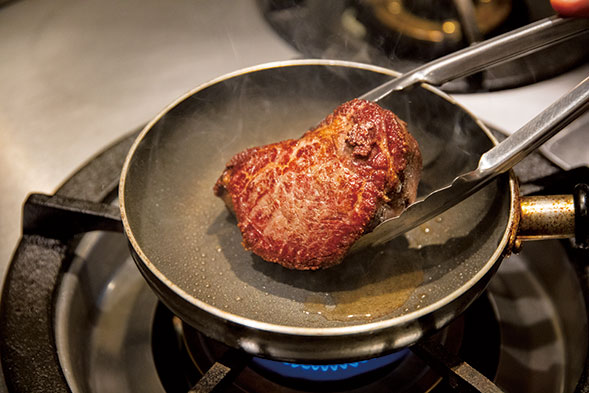 昨今、和牛は海外でも“WAGYU”としてもてはやされているが、「特にサーロインなどはサシが多すぎると私は感じます。まるでフォアグラのようですね。サーロインのように脂身が多い肉をステーキにするなら、グリルプレート を使って、強火で短時間で調理する方が美味しいですよ」。