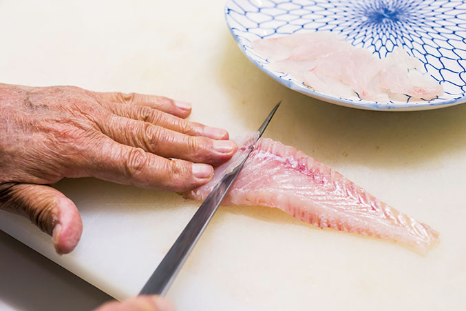 形良く仕上げるには包丁の太い部分を使うこと。薄い削ぎ切りにしやすく、均等な大きさと透けるような薄さに仕上がる。
