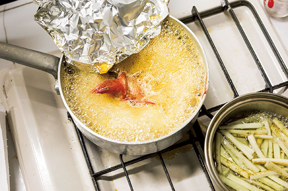 3.5cmの割箸状に切ったゴボウは下茹でし、魚が煮上がる3〜5分前に鍋に入れ、味を含ませる。
