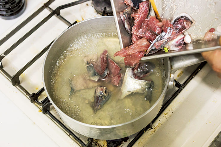 煮汁の量は魚が半分ほど浸かる程度にし、煮立った泡が落し蓋を少し持ち上げる程度の火加減を保って煮ると、全体に煮汁が回って美味しく仕上がる。