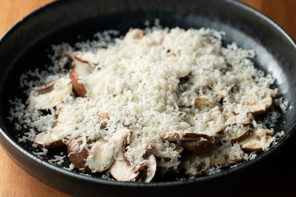 マッシュルームにパルミジャーノ・レッジャーノ、オリーブ油、コショウをかけた「フレッシュマッシュルームとパルミジャーノ(750円)」。ほんのり忍ばせたレモン汁がチーズの酸を補ってアタックを強め優秀なつまみに。
