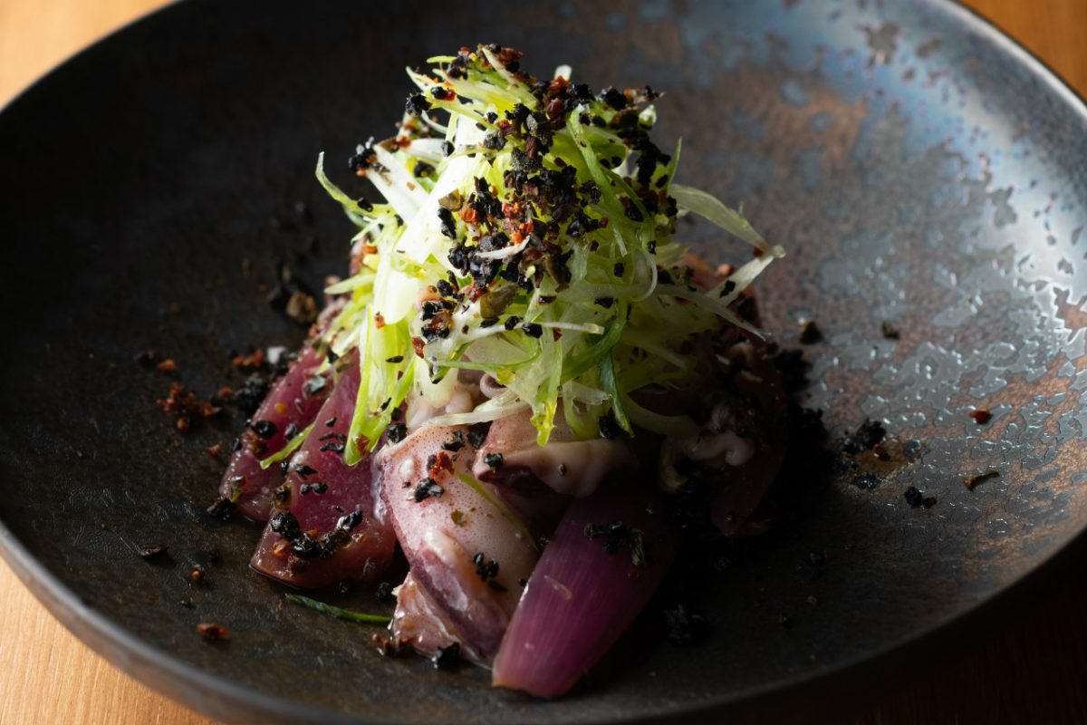 定番のスターター「ヒイカのマリネと九条葱にオリーブのふりかけ(850円)」。レモンとライム、魚醤を利かせたヒイカのマリネに、オリーブ、アンチョビ、ケッパー、ドライトマトを乾燥させたふりかけを合わせるセンスよ。