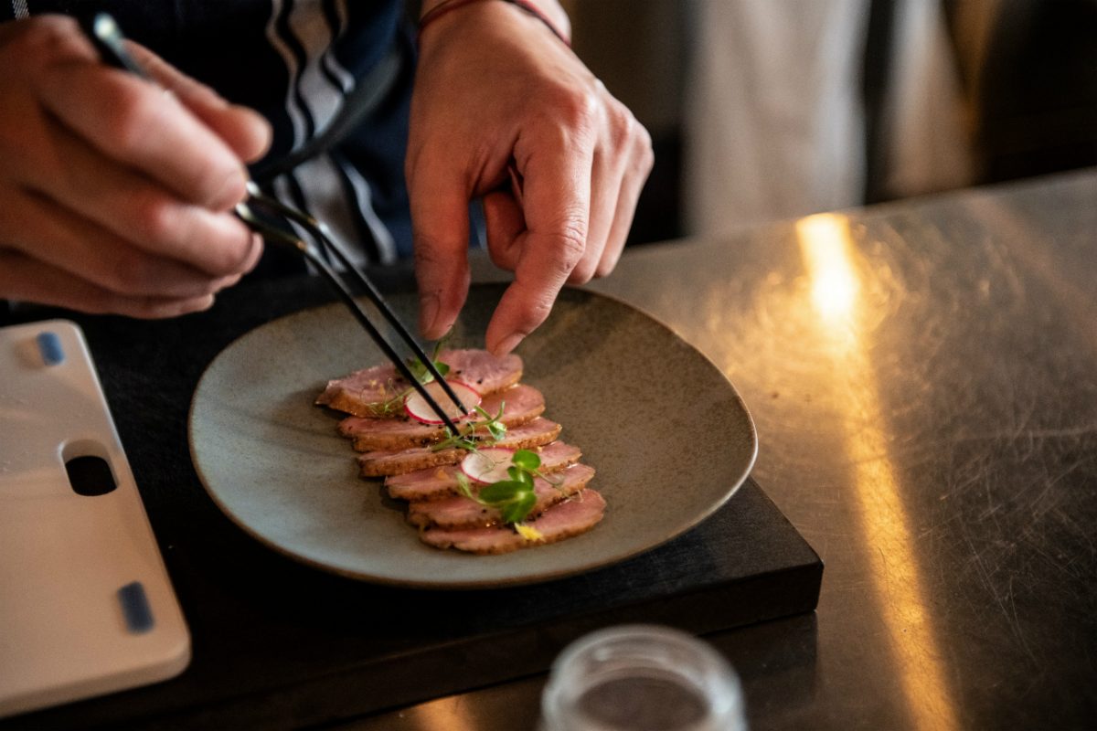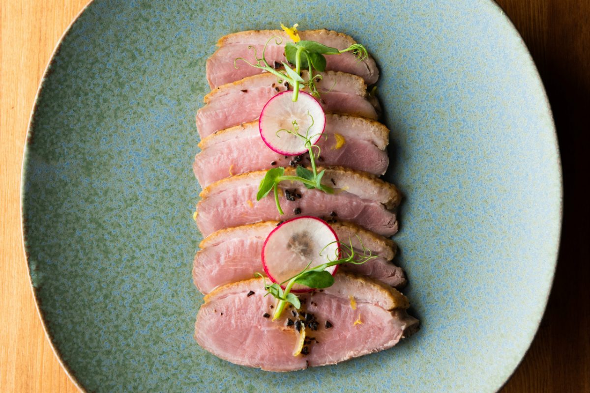 シェフの個性が炸裂した「鴨胸肉の昆布締め(900円)」。味の濃い昆布を使って締めるが、肉の旨味と拮抗して奇跡のバランス。上にあしらわれたレモンのゼストと、昆布の風味をさらに強める塩昆布が完璧に調和する。