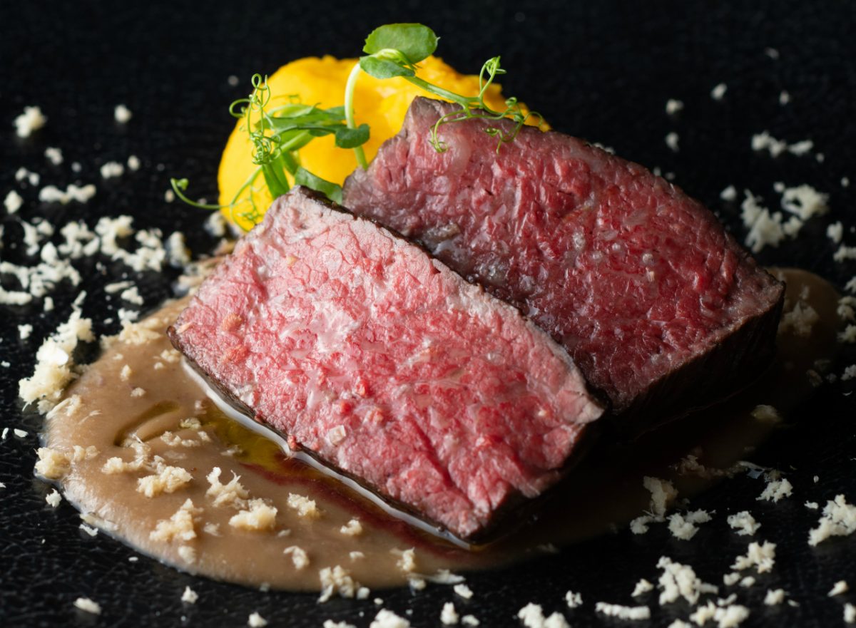 「国産赤身肉ステーキ オニオンソースとホースラディッシュ(1800円)」。55℃の真空低温調理を施した肉を鉄パンで一気に焼き付けた美しい仕上げ。ソースはじっくり炒めた玉ネギを白ワインで煮詰めて、醤油とバターで風味付け。