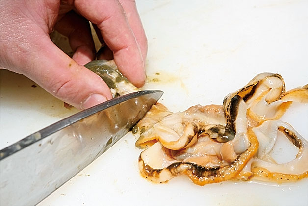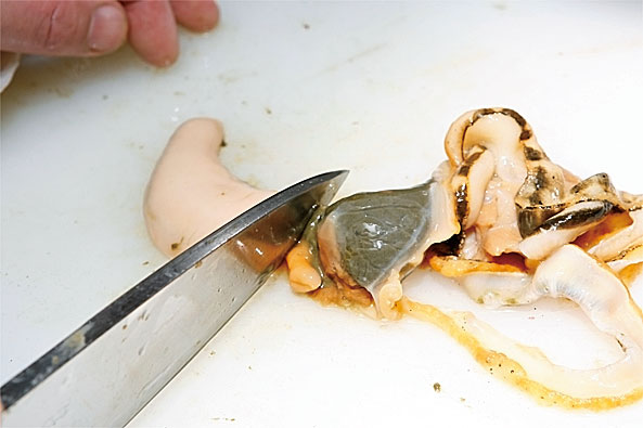 生殖巣を包丁で切り離す。手で引きちぎっても良い。