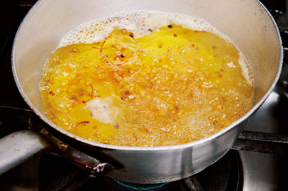 1 シェフは温泉水を使ったが、鶏ガラスープにサフランを入れ、スー プが黄色になるまで弱火にかける。フレゴラを入れ15分程茹でる。