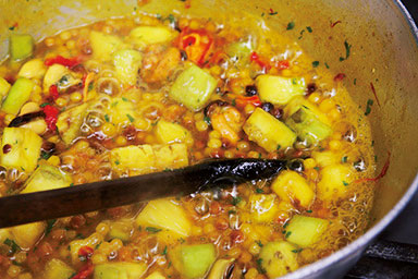 3 ナスの皮を剥き、サイコロ状に切ったものを入れる。ナスがとろとろになるまで煮込み、ムール貝から出た旨味をナスに吸わせる。