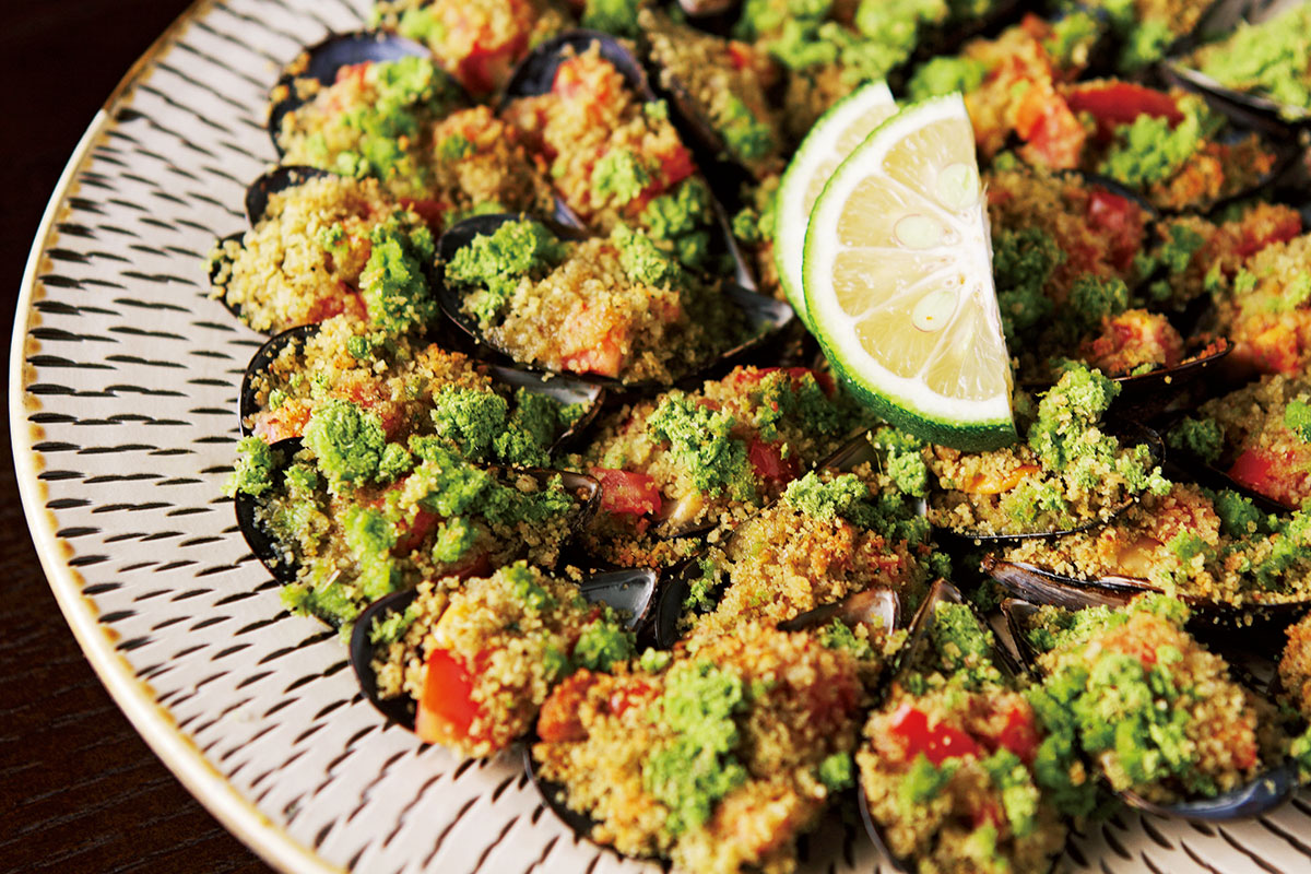 4 緑のおからを作る。おからを乾煎りし、乾燥させる。パセリをすり鉢であたり、その汁をおからに混ぜる。ムール貝に緑のおからをかけ、その上にオリーブ油を注ぐ。230°Cに熱したオーブンで5分焼けば完成。盛り付けてかぼすを添える。