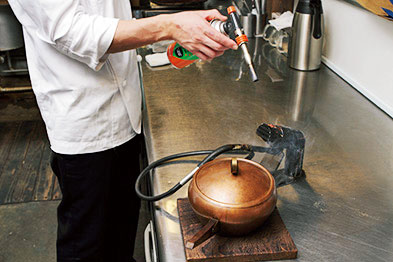 4 着火したスモークウッドをスモークガンにセットし、料理を燻す。