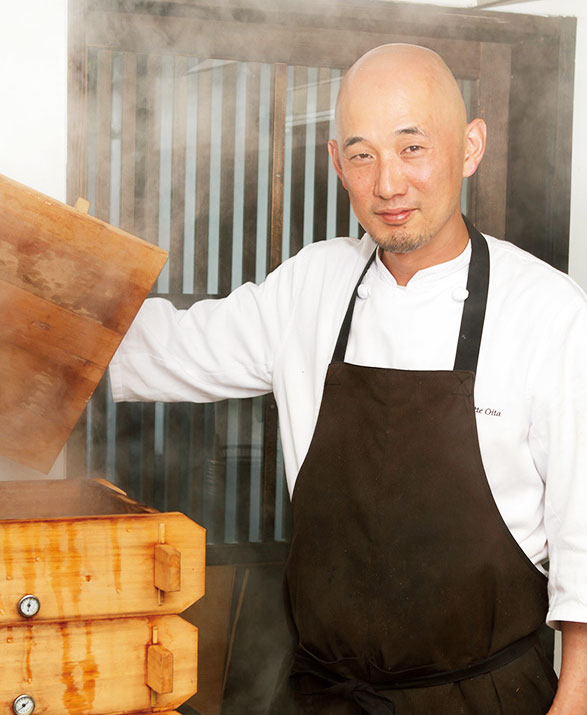 湯布院の名湯『山荘無量塔・アルテジオ』のシェフを務めた後、独立。大分の海と山の幸をふんだんに使った料理が得意。野菜の下処理や、アクアパッツァなどにも地獄釜を使う。パスタを温泉水で茹でただけの素うどんのような裏メニューも。