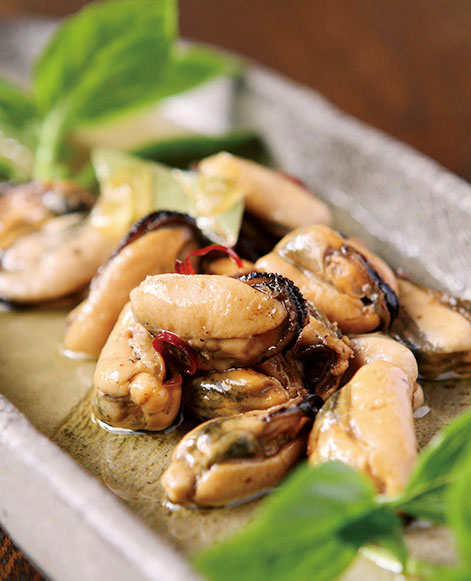 ムール貝のオイル漬け。カキのオイル漬けと同じレシピで作れる。完成したらガラス瓶に移し、ひたひたになるまでオリーブ油を注ぎ、冷蔵庫に。4日で旨味が出てくるので、その後は冷凍庫で保存する。