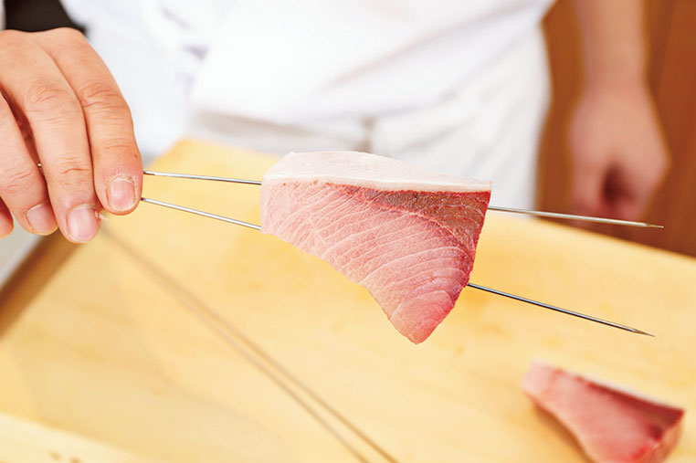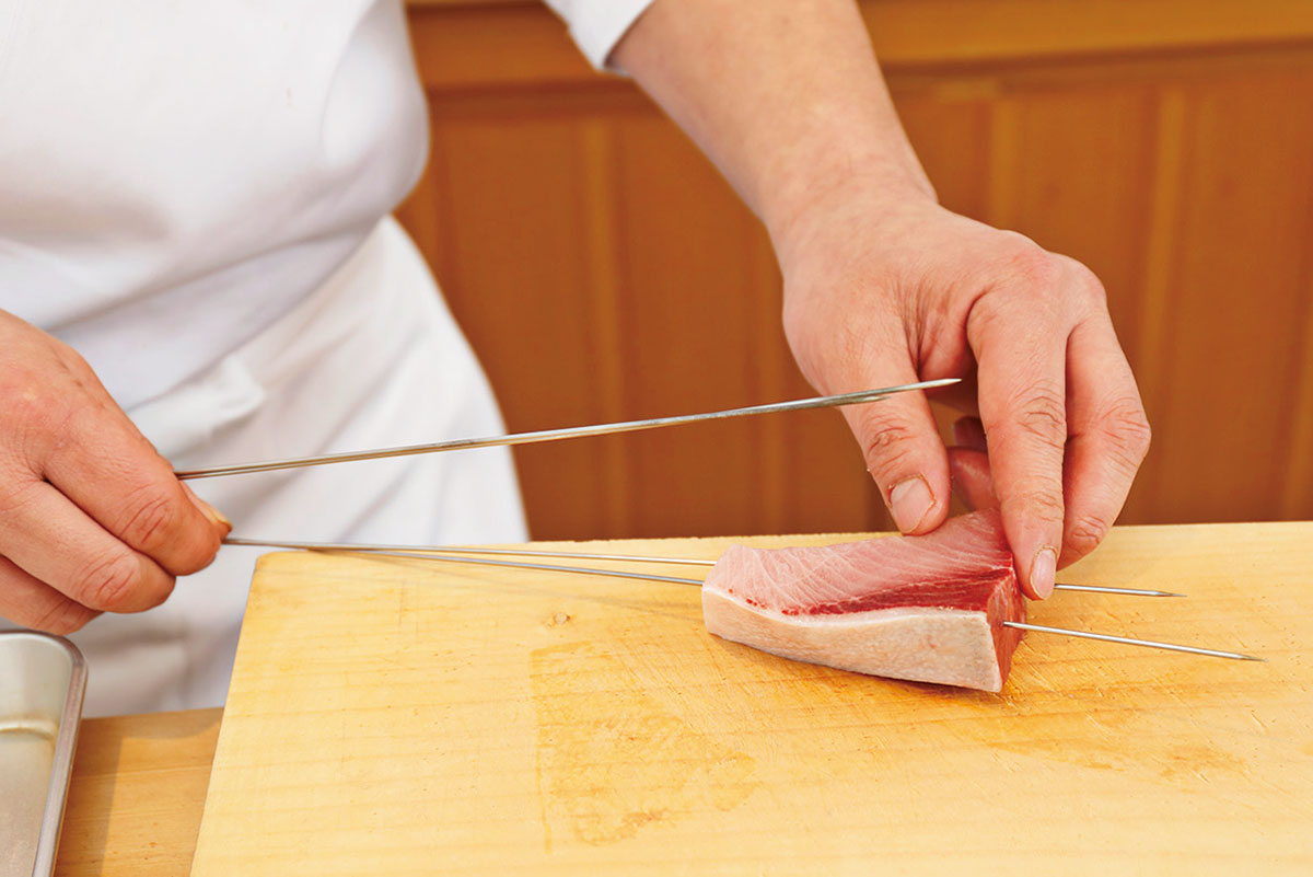 金串は、切り身の幅が狭い方の中心から一本、もう一本は一本目を支えるように打つ。皮面のラインに合わせるのは身崩れ防止のため。